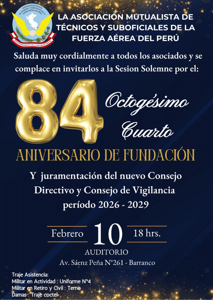 En nombre de cada uno de los integrantes del Consejo Directivo de la Asociación Mutualista de Técnicos y Suboficiales de La Fuerza Aérea del Perú, al asumir el honroso cargo de Presidente, expreso nuestro fraterno saludo y agradecimiento por vuestra concurrencia a esta Sesión Solemne por el Septuagésimo Quinto Aniversario de su fundación; al mismo tiempo, expreso mi respeto y admiración a los fundadores, que en su momento tuvieron la idea clara de ayudarnos mutuamente entre los Técnicos y Suboficiales de la Fuerza Aérea del Perú, dando vida a esta honorable Institución. Asimismo, expreso mi reconocimiento a los ex Directivos y Asociados Ínstitucionaiistas, quienes supieron contribuir al fortalecimiento de esta noble Asociación Mutualista, logrando cristalizar el anhelo de la ayuda solidaria, símbolo del bien común y fraternidad.